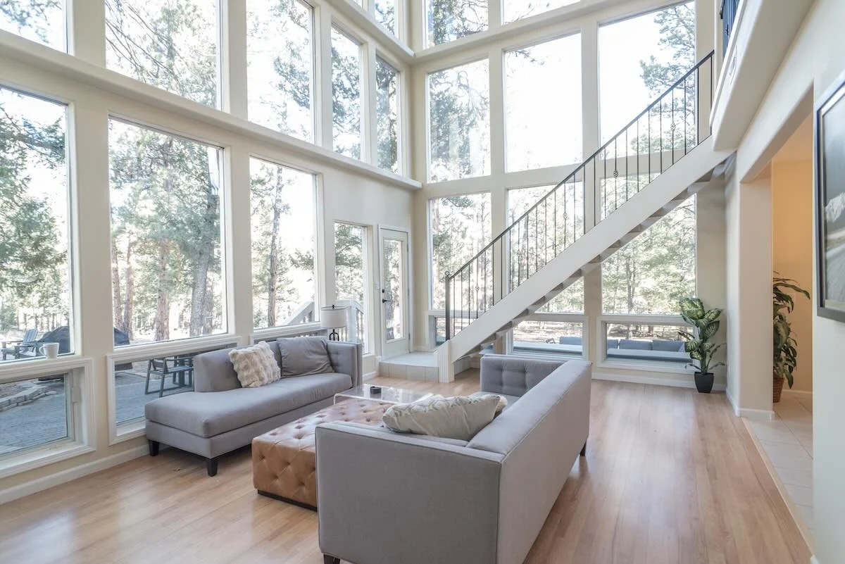 A wall of windows opens the living space to the forest, filling each room with light, texture, and stillness.
