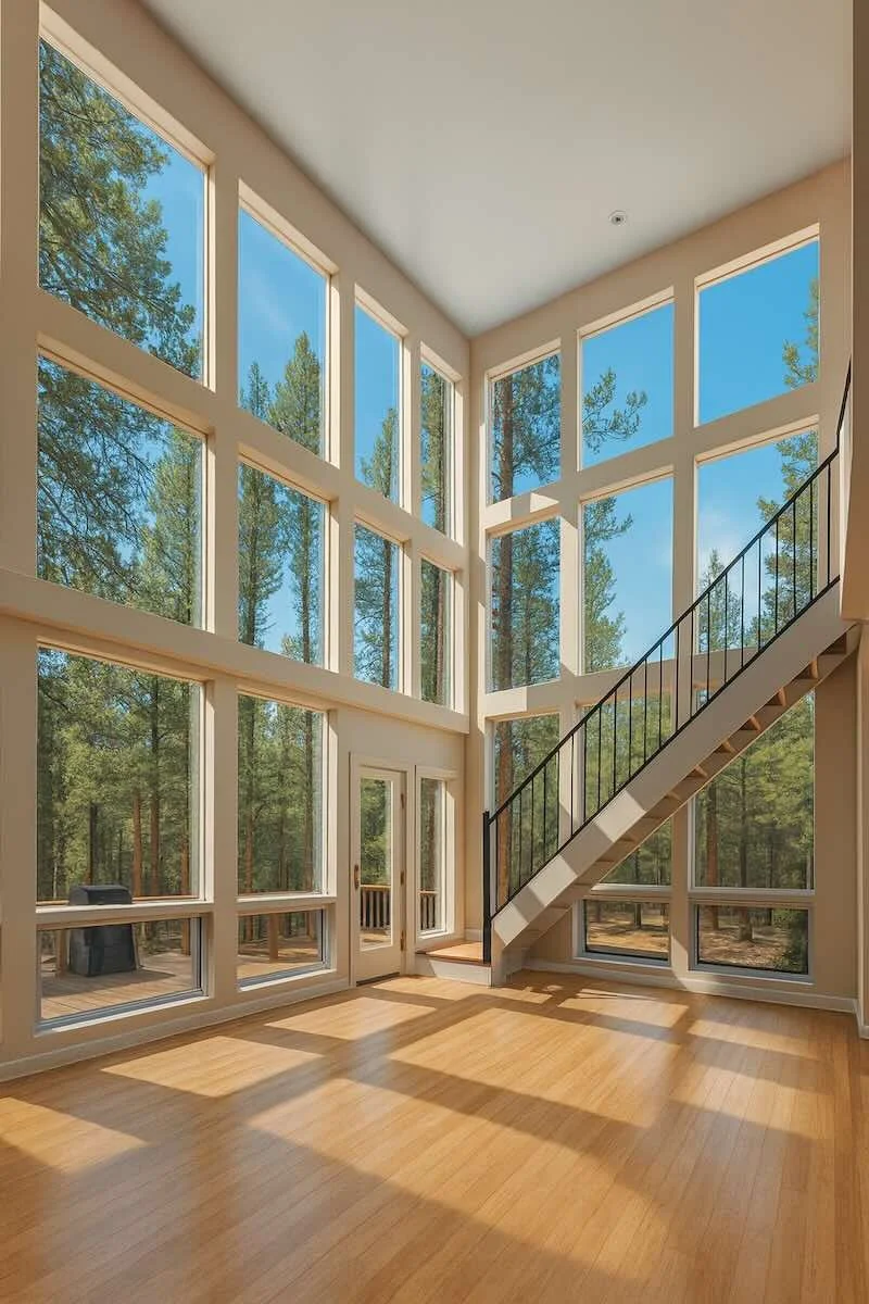 Open Living Area: Vaulted ceilings, pellet stove fireplace, and a dramatic floor-to-ceiling glass wall framing the trees.